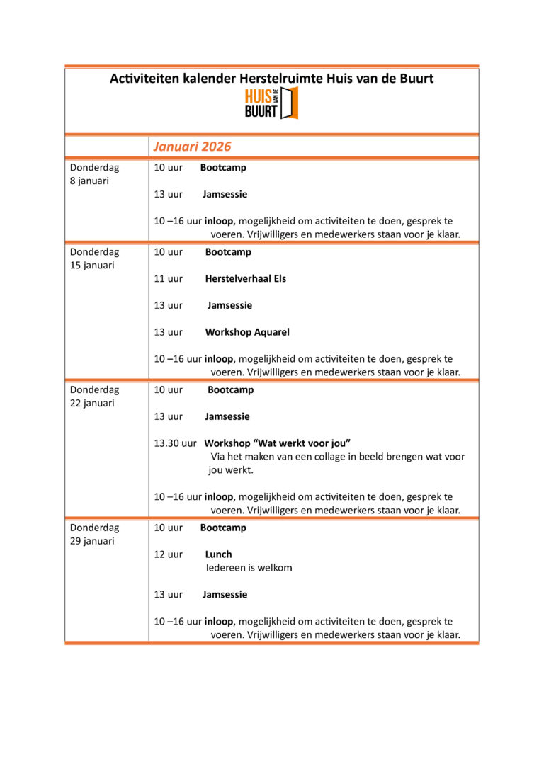De Herstelruimte van het Huis van de Buurt Wolfsbos heeft weer een compleet maandprogramma. De Herstelruimte is gesloten tijdens de kerstvakantie. Je vindt alle info over de maand januari in de afbeelding.