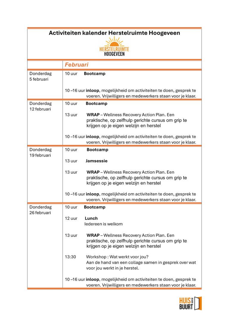 De Herstelruimte van het Huis van de Buurt Wolfsbos heeft weer een compleet maandprogramma. De Herstelruimte is gesloten tijdens de kerstvakantie. Je vindt alle info over de maand februari in de afbeelding.