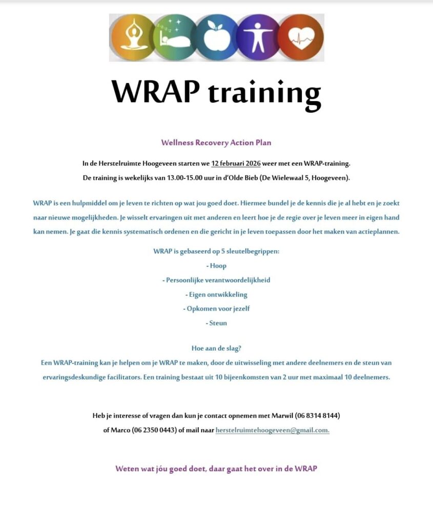 In de Herstelruimte Hoogeveen starten we vanaf 12 februari as. weer met een WRAP-training. WRAP staat voor Wellness Recovery Action Plan en kun je zien als een hulpmiddel om je leven te richten op wat jou goed doet. Lees alle info in bijgaande afbeelding of neem contact op als je vragen hebt.